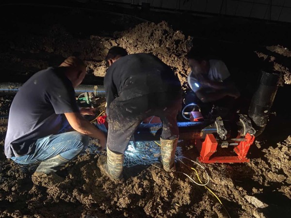 當(dāng)日晚上,臨時(shí)管道鋪設(shè)現(xiàn)場(chǎng),公司客服運(yùn)營(yíng)副總經(jīng)理尹邦交、大管網(wǎng)部王毅總監(jiān)親臨現(xiàn)場(chǎng)指導(dǎo)。在工程公司的協(xié)助下,施工工具、施工器材準(zhǔn)時(shí)到位,領(lǐng)材料、熔管道、開(kāi)孔、開(kāi)挖溝槽、布管等各程序緊張有序地進(jìn)行。由于連日陰雨,現(xiàn)場(chǎng)道路泥濘,且當(dāng)日夜晚仍舊下著小雨,泥水混著雨水鉆進(jìn)維修人員的衣服里,污泥沒(méi)過(guò)維修人員的膝蓋,每抬腳一步,都很吃力。盡管天公不作美,但這絲毫不影響維修質(zhì)量,為了不影響管材熱熔效果,維修人員撐著雨傘,用身體擋著雨水;為了不影響管材的清潔,48米長(zhǎng)的DN160PE管道,全部在干凈的道路上熱熔成一整根,再運(yùn)送到施工現(xiàn)場(chǎng)。由于道路條件限制,8名維修人員硬是靠著肩膀一步一個(gè)腳印運(yùn)送了300多米,途中所有人員都自覺(jué)地把管材緊緊抱在懷中,只為保持管材清潔,以免影響供水質(zhì)量。