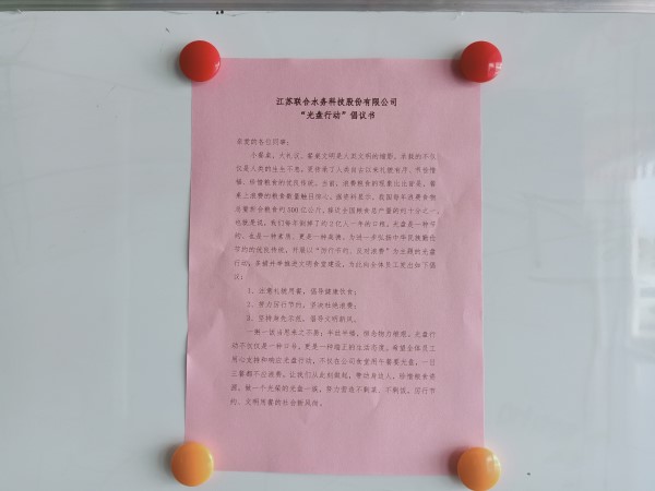 首先公司向全體員工發(fā)出了“光盤行動”的倡議書,通過郵件發(fā)到各部門,要求部門集中學(xué)習(xí),領(lǐng)會活動精神,同時,在公司辦公樓宣傳欄、食堂門口等公共區(qū)域進(jìn)行張貼,便于員工隨時閱讀,營造一種濃厚的活動氛圍。