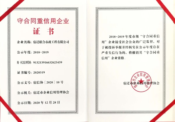 2020年歲末,宿遷市企業(yè)信用管理協(xié)會(huì)公示了《2018-2019年度宿遷市市級(jí)“守合同重信用”企業(yè)公示名單》,宿遷聯(lián)合市政工程有限公司榮膺在列,經(jīng)過公示,最終2021年1月下旬,證書和牌匾正式下發(fā)到獲獎(jiǎng)企業(yè)。能獲此榮譽(yù)稱號(hào)是對宿遷聯(lián)合市政多來以來堅(jiān)持守合同重信用工作的認(rèn)可與肯定。