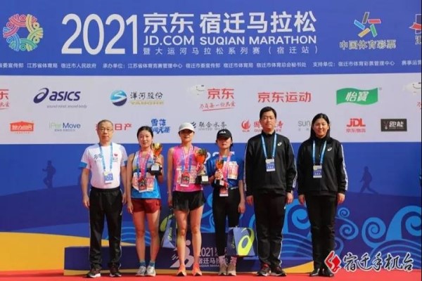 在半馬終點(diǎn)——宿遷市奧體中心,俞偉景受邀為半馬女子項(xiàng)目獲獎(jiǎng)?wù)哳C獎(jiǎng),對(duì)她們巾幗英雄的風(fēng)采給予了高度贊揚(yáng)。