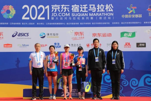 在半馬終點——宿遷市奧體中心,俞偉景受邀為半馬女子項目獲獎?wù)哳C獎,對她們巾幗英雄的風(fēng)采給予了高度贊揚。
