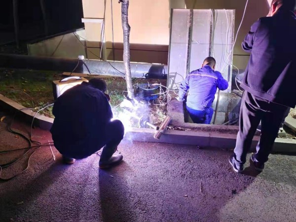 在更換前,工作人員打開閥門排水,鐵鏟、電焊機等工具搬運到了更換現(xiàn)場;潛水泵、角磨機、照明燈也安裝到位。大家分工有序,有的拿著角磨機在進行管道切割;有的拿著焊槍在進行更換管道的焊接;有的拿著鐵鍬在繼續(xù)挖出管道……