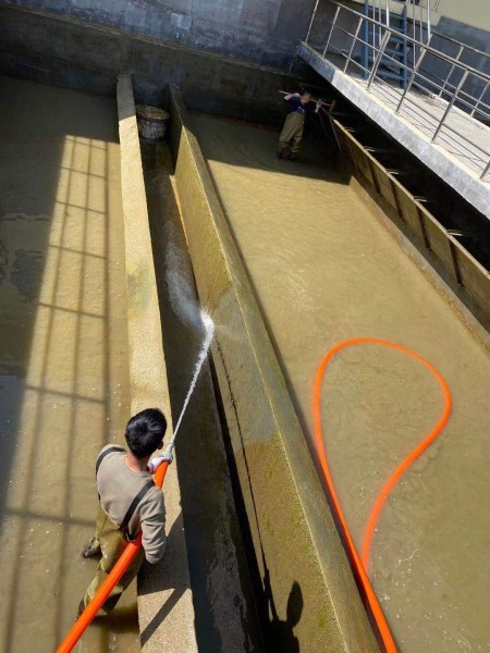 第二水廠(chǎng)的沉淀池與砂濾池在半個(gè)月前還沒(méi)有明顯的藻類(lèi)、青苔,但最近一周內(nèi)開(kāi)始泛濫。目前雖未達(dá)用水高峰期,但這也引起了制水部的重視,隨即便制定清理方案,安排人員先在18號(hào)對(duì)四期2個(gè)沉淀池和10個(gè)砂濾池進(jìn)行清理。清理作業(yè)當(dāng)天正值周日,康經(jīng)理卻已早早地來(lái)到清理作業(yè)現(xiàn)場(chǎng),不管是安全事項(xiàng)還是作業(yè)質(zhì)量,都再次跟作業(yè)人員進(jìn)行了交代與確認(rèn),以確保清理作業(yè)的順利完成。作業(yè)過(guò)程中采用高壓水槍沖洗和人工清理組合的方式,挨個(gè)對(duì)池體進(jìn)行停運(yùn)、排空、清理。經(jīng)過(guò)一整天的作業(yè),伴隨著10號(hào)砂濾池的開(kāi)始沖洗,四期的池子已經(jīng)全部清理結(jié)束,進(jìn)水槽和排水渠都看不到藻類(lèi)、青苔的存在。鑒于這次的清理效果較好,在后面的幾天里會(huì)繼續(xù)對(duì)其他三套系統(tǒng)的池體進(jìn)行清理。