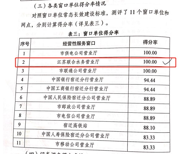 為全面評估今年以來市區(qū)文明城市長效建設(shè)有效成果,宿遷市長效辦根據(jù)年度工作安排,對照2021年版《全國文明城市(地級以上)測評體系》,委托第三方調(diào)查機(jī)構(gòu)開展了上半年市區(qū)文明城市長效建設(shè)指數(shù)測評。在此次測評中,江蘇聯(lián)合水務(wù)科技股份有限公司宿遷公司營業(yè)廳榮獲經(jīng)營性服務(wù)窗口100分,排名第一(并列)。