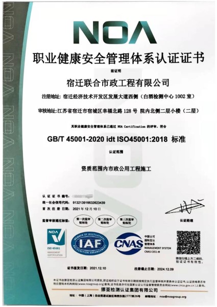 宿遷聯合市政工程有限公司于2018年開展三大體系認證(環(huán)境管理體系、職業(yè)健康安全管理體系、質量管理體系認證),2021年是新一輪認證年審第一年。通過一直以來規(guī)范化的管理與運營,宿遷聯合市政工程有限公司順利通過新一輪三大體系年審。審核過程中,審核老師首先到施工現場實地了解在建工程施工情況,從工程進度、工程質量、采購流程、設計變更等多方面進行審查。隨后查看了施工資料、報驗資料、檢驗資料等書面材料。通過多方面的審查考核,審核老師對我公司規(guī)范化的施工給予了充分肯定,最終一致同意通過審核。