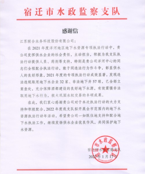 (圖2:公司獲得宿遷市水政監(jiān)察支隊(duì)感謝信)