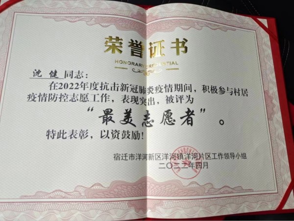 此輪疫情期間,洋河服務(wù)中心共組織14人次參加洋河新區(qū)交通建設(shè)局組織的志愿服務(wù)活動(dòng),12人次參加防疫維穩(wěn)工作。居家辦公員工就近參加社區(qū)服務(wù),中心員工劉瑋、沈建,化身為社會(huì)防疫工作的 “大白”,積極參與防疫工作。4月18日,洋河新區(qū)授予沈健“最美志愿者”稱號(hào)。