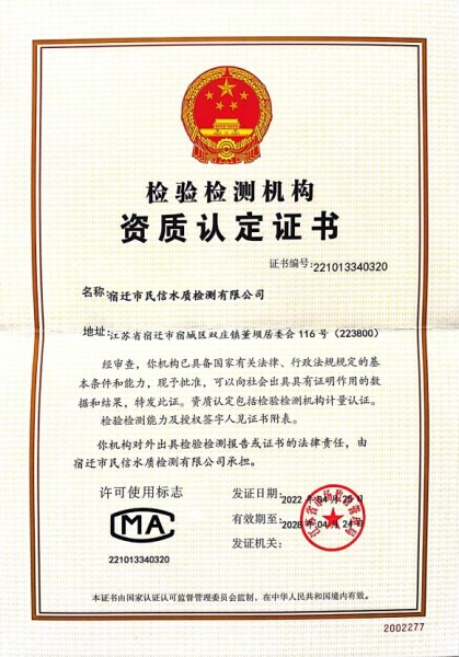近日,宿遷市民信水質(zhì)檢測有限公司順利通過CMA資質(zhì)認定復(fù)評審及擴項現(xiàn)場評審,獲得了江蘇省市場監(jiān)督管理局發(fā)放的檢驗檢測機構(gòu)資質(zhì)認定證書,批準的檢測能力范圍包含三類共計132個參數(shù)。
