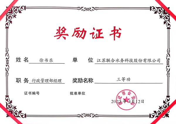 為表彰2021年在全市平安水域創(chuàng)建工作中涌現(xiàn)出的先進(jìn)典型,激發(fā)涉水單位和個(gè)人忠誠(chéng)履職、擔(dān)當(dāng)作為的昂揚(yáng)斗志,近日,宿遷市公安局對(duì)全市涉水單位平安創(chuàng)建成績(jī)突出集體和個(gè)人進(jìn)行表彰,授予了江蘇聯(lián)合水務(wù)科技股份有限公司宿遷供水公司徐書(shū)樂(lè)同志涉水單位平安創(chuàng)建成績(jī)突出個(gè)人“三等功”榮譽(yù)稱號(hào)。