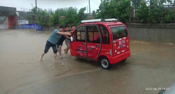 近期,暴雨天氣較多,一天下午,我們?cè)谕馇诠ぷ魍局,剛好遇上風(fēng)雨交加并伴有少量冰雹的惡劣天氣。當(dāng)我們要經(jīng)過一處火車道涵洞口時(shí),發(fā)現(xiàn)里面已有積水現(xiàn)象,正在判斷是否可以通過時(shí),突然一輛紅色電動(dòng)三輪車從遠(yuǎn)處向涵洞口駛來。由于當(dāng)時(shí)風(fēng)雨較大,還沒來得及勸阻,車子就直接駛?cè)肓撕础5胶粗虚g時(shí),由于水位過高,三輪車突然失去了動(dòng)力,停在水中無法動(dòng)彈。