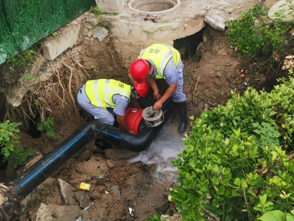 維修人員到達現場后,立即關閉該段閥門,并發(fā)出停水通知。由于該供水管道擔負著金雞湖路周邊百余家工廠和附近居民的用水,維修員們一刻沒有停歇,摸清管道基本情況后,在公司領導的帶領下迅速制定好搶修方案。