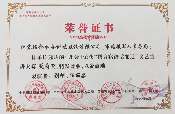 2022年8月31日下午,一場精彩的文藝宣講大賽在宿遷市文化館的小劇場拉開了帷幕,由宿遷市委組織部、市級機(jī)關(guān)工委、文化和廣電旅游局和市總工會主辦的第七屆市級機(jī)關(guān)文化節(jié)在這里隆重舉行,共23個單位28個節(jié)目300多位演員在這里緊張角逐,最終江蘇聯(lián)合水務(wù)科技股份公司宿遷供水公司精心打造的節(jié)目--快板書《開會》奪得比賽二等獎。