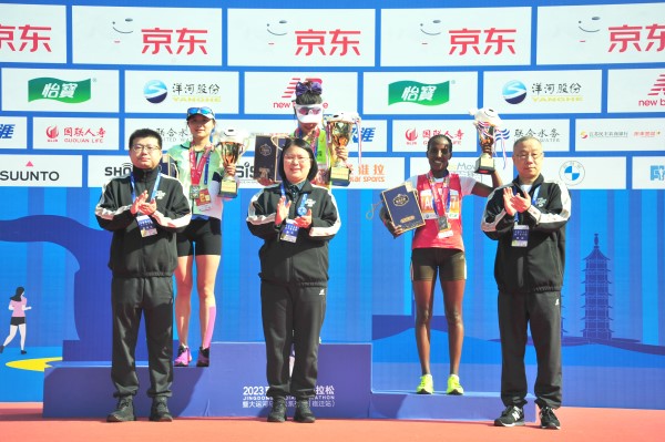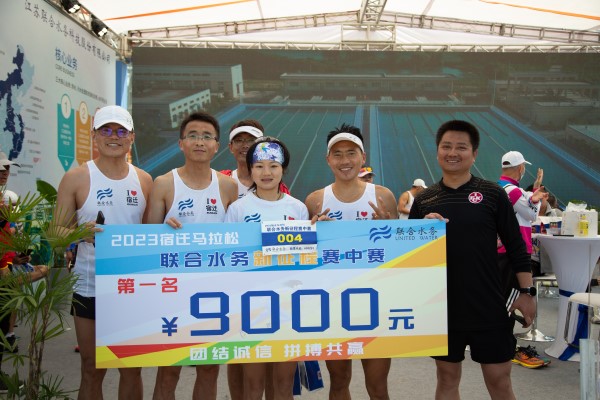 在宿遷奧體中心,聯(lián)合水務(wù)董事長兼總裁俞偉景先生受邀為“半馬”女子項目獲獎?wù)哳C獎,對獲獎選手表達了衷心的祝賀并合影留念。