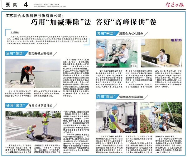 入夏以來,宿遷市連續(xù)發(fā)布高溫黃色預(yù)警信號,用水量隨氣溫一路攀升,城市供水迎來夏季“大忙”。聯(lián)合水務(wù)宿遷供水公司日供水量最高值突破39.7萬噸,再創(chuàng)歷史新高。結(jié)合往年夏季高峰供水特點和形勢,公司巧用“加減乘除”法,精心部署、強化舉措,確保今夏供水量足、水壓穩(wěn)、水質(zhì)優(yōu)。