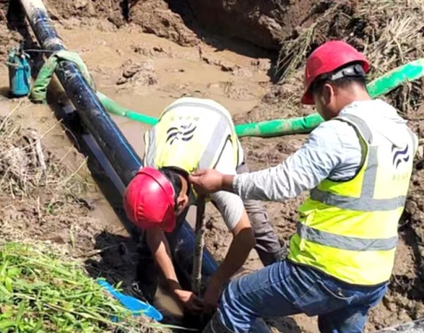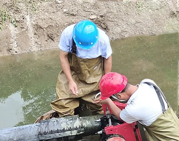 在全員的緊密排查之下,終于確定爆管準(zhǔn)確位置,爆管管線位于河道河床下,爆管處位于橋墩主體結(jié)構(gòu)內(nèi),無法進(jìn)行挖掘。經(jīng)過現(xiàn)場勘察及反復(fù)論證,最終確定搶修方案:廢除橋墩內(nèi)原有管道,于橋墩兩側(cè)將原管道截?cái),并改為掛橋管,爭取破壞最小、速度最快。搶修方案一?jīng)確定,相關(guān)人員立即開工,連夜安排挖掘機(jī)及搶修材料進(jìn)場,隨即展開快速搶修,第一時(shí)間恢復(fù)供水。