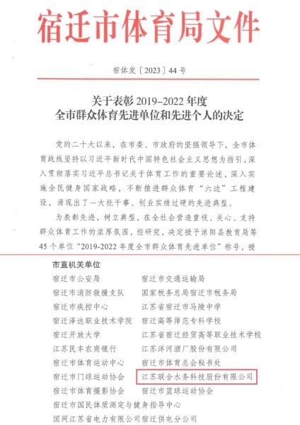 近日,宿遷市體育局發(fā)布《關(guān)于表彰2019-2022年度全市群眾體育先進(jìn)單位和先進(jìn)個(gè)人的決定》,江蘇聯(lián)合水務(wù)科技股份有限公司(下稱“聯(lián)合水務(wù)”)榮獲“全市群眾體育先進(jìn)單位”稱號(hào)。