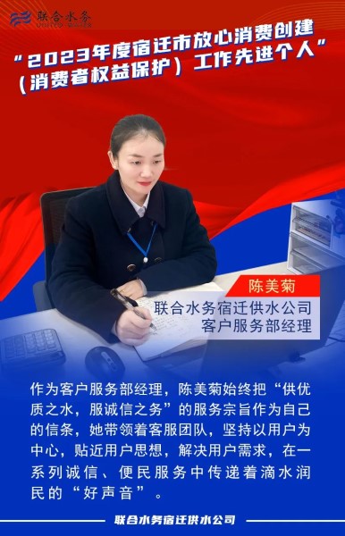水是生命之源、生產(chǎn)之要、生態(tài)之基,讓用戶用上“放心水”,是聯(lián)合水務(wù)人義不容辭的責(zé)任與擔(dān)當(dāng)。近日,為表彰在江蘇省宿遷市放心消費(fèi)創(chuàng)建工作中涌現(xiàn)出的先進(jìn)典型,充分調(diào)動(dòng)各方參與放心消費(fèi)創(chuàng)建工作的積極性,宿遷市放心消費(fèi)創(chuàng)建活動(dòng)領(lǐng)導(dǎo)小組辦公室下發(fā)了《關(guān)于表彰2023年度宿遷市放心消費(fèi)創(chuàng)建(消費(fèi)者權(quán)益保護(hù))工作先進(jìn)個(gè)人的通報(bào)》,聯(lián)合水務(wù)宿遷供水公司客戶服務(wù)部經(jīng)理陳美菊被表彰為“2023年度宿遷市放心消費(fèi)創(chuàng)建(消費(fèi)者權(quán)益保護(hù))工作先進(jìn)個(gè)人”。