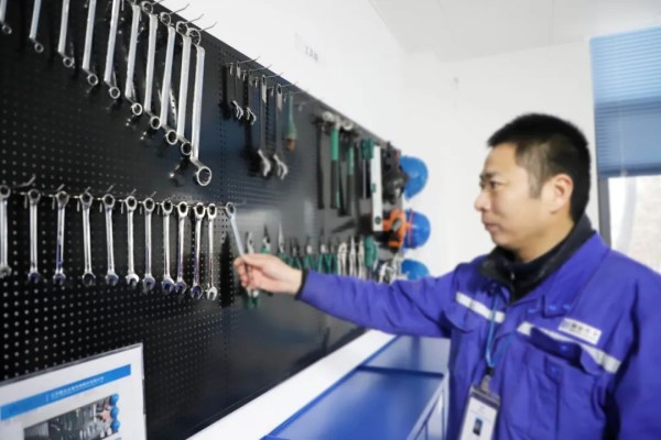 機電人很少有時間能坐在辦公室,他們更多的是與設備為伍,工作服經(jīng)歷過一場場維修后留下了深淺不一的印跡,在他們的維修間內,分門別類整齊地擺放著各種維修工具,機電人對于它們各自擺放的位置了然于心,維修工具雖然冰冷,但整潔有序的擺放也能給人帶來愉悅之感。