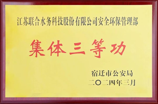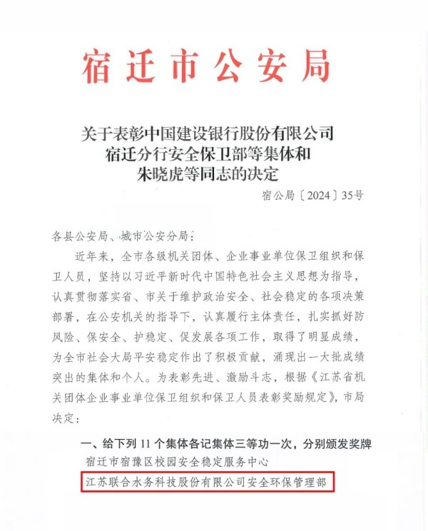 3月27日上午,江蘇省宿遷市公安局在全市治安保衛(wèi)重點單位安保工作會議上對全市社會大局平安穩(wěn)定作出積極貢獻、成績突出的集體和個人進行了表彰,江蘇聯(lián)合水務科技股份有限公司安全環(huán)保管理部榮獲“集體三等功”榮譽稱號,公司副總經理趙軍代表公司接受表彰。
