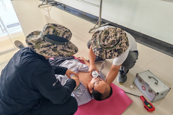 首先,演練團(tuán)隊(duì)模擬作業(yè)人員在巡檢時(shí)突發(fā)中暑倒地,隨行人員發(fā)現(xiàn)后立即匯報(bào)應(yīng)急小組組長(zhǎng),應(yīng)急小組組長(zhǎng)立即趕往現(xiàn)場(chǎng)并啟動(dòng)應(yīng)急預(yù)案。隨后,針對(duì)員工中暑情況,演練團(tuán)隊(duì)及時(shí)啟動(dòng)員工救援程序,救援人員迅速攜帶急救藥箱趕赴現(xiàn)場(chǎng),對(duì)中暑員工進(jìn)行緊急救治,并安全轉(zhuǎn)移到陰涼通風(fēng)處平臥,及時(shí)給患者頭部捂上冷毛巾及擦拭酒精降溫,飲用清涼飲料及時(shí)補(bǔ)水,通過按壓穴位使患者蘇醒,并根據(jù)患者情況及時(shí)送醫(yī)治療。
