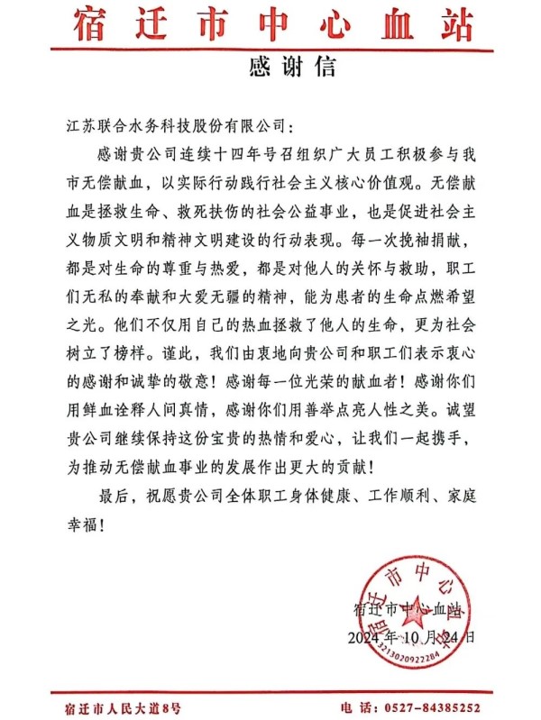 10月24日,江蘇聯(lián)合水務(wù)科技股份有限公司收到了來自江蘇省宿遷市中心血站的感謝信。信中對公司主動承擔社會責任、充分展現(xiàn)企業(yè)擔當和對無償獻血活動的大力支持表示感謝。這不僅是對公司獻血志愿者們無私奉獻的肯定,更是對聯(lián)合水務(wù)踐行社會責任、傳遞文明正能量的極高贊譽。