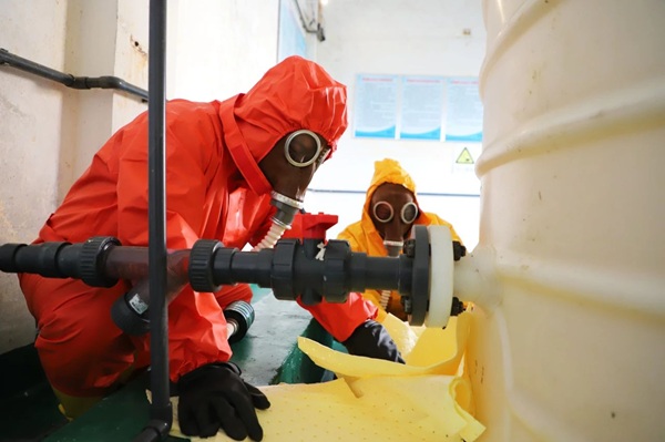 在耿車污水處理廠,公司成功開展了鹽酸間鹽酸泄漏應(yīng)急演練,演練模擬了突發(fā)鹽酸泄漏事故,值班人員迅速響應(yīng),第一時間關(guān)停運行設(shè)備,穿戴好防護用品后,組織人員撤離至安全區(qū)域。搶修組同事對事故設(shè)備進行搶修,查找鹽酸泄漏原因,關(guān)閉出料口閥門,并對泄漏現(xiàn)場進行安全處置。演練過程中,各小組分工明確、反應(yīng)迅速,充分檢驗了公司各項應(yīng)急預(yù)案的科學(xué)性和實用性。