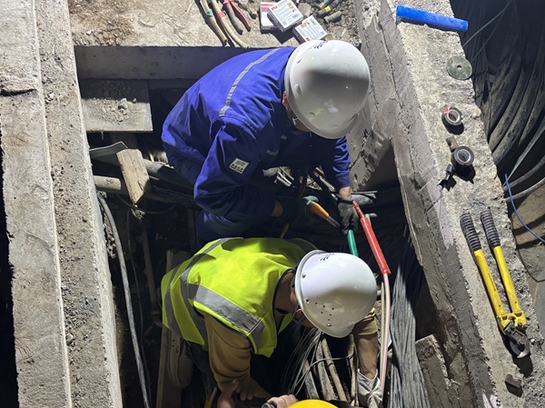 傍晚臨近下班時分,機(jī)電設(shè)備部接到項目部緊急通知,二水廠五期項目現(xiàn)場有電纜疑似破損發(fā)熱,隨時有斷電風(fēng)險。機(jī)電設(shè)備部人員經(jīng)現(xiàn)場查看發(fā)現(xiàn),由二水廠一期低壓配電室通往一二期反沖洗泵房配電間主電纜損壞,隨時可能影響一二期生產(chǎn)運(yùn)行。搶修就是命令,制水部、機(jī)電設(shè)備部、項目部快速分工,在保障安全生產(chǎn)的前提下,對破損電纜進(jìn)行了緊急搶修。搶修人員爭分奪秒,凌晨悄然而至,直到搶修隊伍中有人喊出一聲“回家!”,這場“夜間聯(lián)合作戰(zhàn)”才宣告結(jié)束。