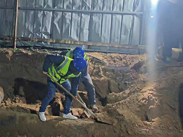 近日,皂河、黃墩、王官集三個鄉(xiāng)鎮(zhèn)DN500供水主管網(wǎng)壓力異常,情況緊急,公司迅速啟動夜間應(yīng)急響應(yīng)機(jī)制,由管網(wǎng)部總監(jiān)劉朗牽頭,帶隊支援皂河區(qū)域供水服務(wù)中心,一支由20余人組成的聯(lián)合巡線搶修隊快速集結(jié),在深夜展開了一場與時間賽跑的搶修戰(zhàn)。凌晨00:30,搶修隊在一處施工場地圍擋內(nèi)發(fā)現(xiàn)了漏點,漏點較為隱蔽,且漏水量大。為盡可能縮短停水時間、減少水量損失,搶修人員迅速制定了維修方案,采用同步作業(yè)模式,機(jī)械開挖與人工清淤交替進(jìn)行,確保作業(yè)高效推進(jìn)。從發(fā)現(xiàn)漏點到完成受損管段維修,僅用4個小時。凌晨04:30,供水系統(tǒng)全面恢復(fù),高峰期用戶的正常用水得到有力保障。