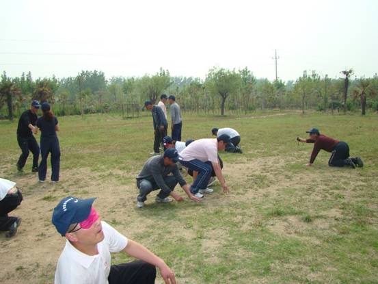 盲人方陣,是把我們每個(gè)人的眼睛罩上,然后,教練東推一個(gè),西挪一個(gè),將我們的位置全部打亂。地上扔幾條繩子,我們蹲下來(lái)在地上摸呀摸呀,摸到以后將幾條繩子結(jié)起來(lái),大家握住繩子,組成最大的正方隊(duì)形。