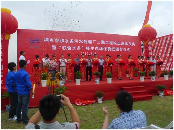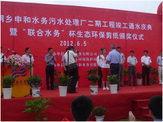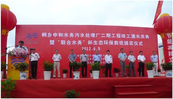 2012年6月5日上午,正值世界環(huán)境日,由聯(lián)合水務(wù)集團投資擴建的桐鄉(xiāng)申和水務(wù)有限公司污水處理廠二期工程竣工通水慶典暨“聯(lián)合水務(wù)”杯生態(tài)環(huán)保剪紙頒獎儀式在浙江省桐鄉(xiāng)市隆重舉行。