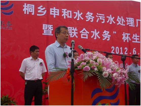 接下來,由聯(lián)合水務(wù)集團總裁俞偉景先生為慶典致辭。他表示,桐鄉(xiāng)申和水務(wù)有限公司通過四年來的不斷努力,日處理能力從3萬噸/日擴增為目前的6萬噸/日,為開發(fā)區(qū)的建設(shè)發(fā)展、為桐鄉(xiāng)市水環(huán)境治理改善做出了貢獻。聯(lián)合水務(wù)在桐鄉(xiāng)的發(fā)展,得到了市委市政府的重視、關(guān)心和支持,得到了開發(fā)區(qū)管委會、市建設(shè)局,市環(huán)保局,市發(fā)改局、財政、物價、工商、稅務(wù)、水務(wù)集團、工商銀行等各部門的支持和幫助。聯(lián)合水務(wù)一直積極倡導(dǎo)以“政府-投資者-員工-客戶”多贏的模式推動中國水務(wù)行業(yè)的改革與發(fā)展,未來將再接再厲,以專業(yè)化、現(xiàn)代化和規(guī)范化的管理,運行好桐鄉(xiāng)申和水務(wù)污水處理廠,確保各項出水指標穩(wěn)定達標,為桐鄉(xiāng)市城市環(huán)境質(zhì)量的改善再作貢獻,為桐鄉(xiāng)經(jīng)濟的發(fā)展作貢獻!