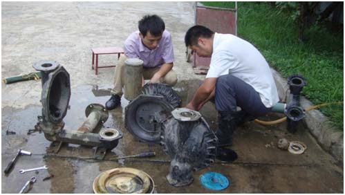 機電管理員有步驟對氣動隔膜泵進行拆卸,每一步都有記錄,這樣方便重新組裝,很快便找到了機器不運轉(zhuǎn)的原因,是因為氣動隔膜泵內(nèi)部沉積太多的沙子導(dǎo)致葉輪轉(zhuǎn)不動,淤泥輸送不暢。機電管理員周德良帶領(lǐng)大家將氣動隔膜泵從泵池中拉出,對其進行了徹底清理之后果然正常運轉(zhuǎn)。