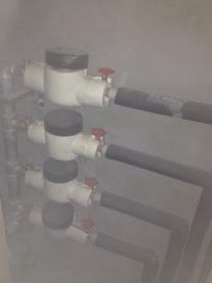 水表防凍也是施工中較為重要的一項(xiàng)工作,主要分為室外表井的防凍和高層管道井的防凍。室外水表井中的水表雖然低于自然地面30cm,位于凍土層下面,但是水表井中沒有任何覆蓋物,因此每年都有很多水表還沒有投入使用便已經(jīng)凍壞。為此,我們在水表安裝完畢試水合格之后,將水表井中填滿黃沙至水表頂部,既不影響抄表,又能防止凍壞,一勞永逸。高層管道井中的水表防凍是個(gè)新課題,但我們的做法或許也得到了滿分。水表本身加裝保溫套、表前和表后的管道均裹上保溫棉,這樣的裝扮足以應(yīng)付寒冷的冬季了。