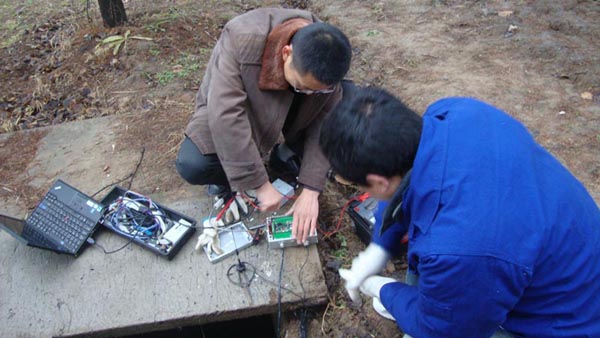工作人員與廠家技術(shù)人員對(duì)壓力監(jiān)測(cè)傳輸設(shè)備進(jìn)行調(diào)試