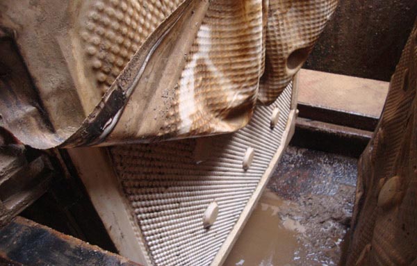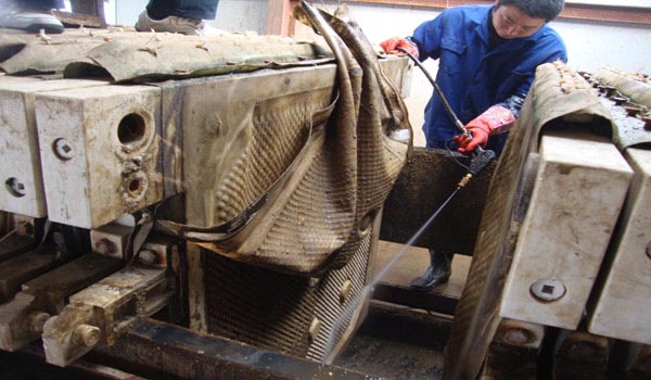 近期,一水廠的板框壓濾機出水量一直不理想,出泥頻率低。調(diào)度中心工作人員對整套設(shè)備進行檢查后,發(fā)現(xiàn)濾布下面堆積了很多污泥,有些出水孔已經(jīng)被污泥堵死。工作人員分析造成出水量小的原因很可能是板框和濾布之間的污泥造成的。