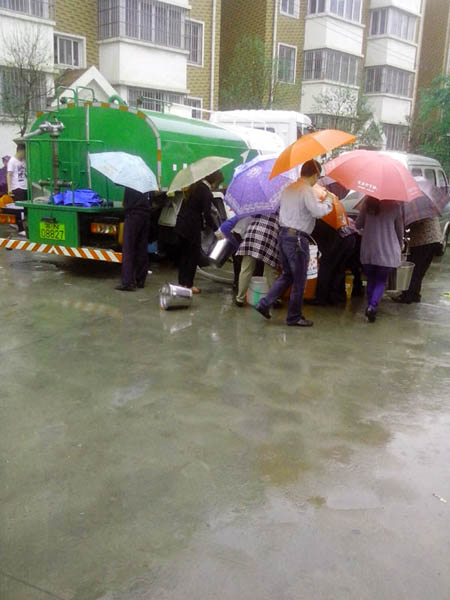 大約1小時(shí)左右,兩輛水車駛進(jìn)停水小區(qū)開(kāi)始送水,兩名稽查員各負(fù)責(zé)一臺(tái)水車。為了使停水造成的影響降至最低,兩名稽查員按要求逐個(gè)小區(qū)輪流送水,一直忙到中午12時(shí)30分左右才結(jié)束,此舉深受居民好評(píng)。下圖為在聚福園小區(qū)送水場(chǎng)景。