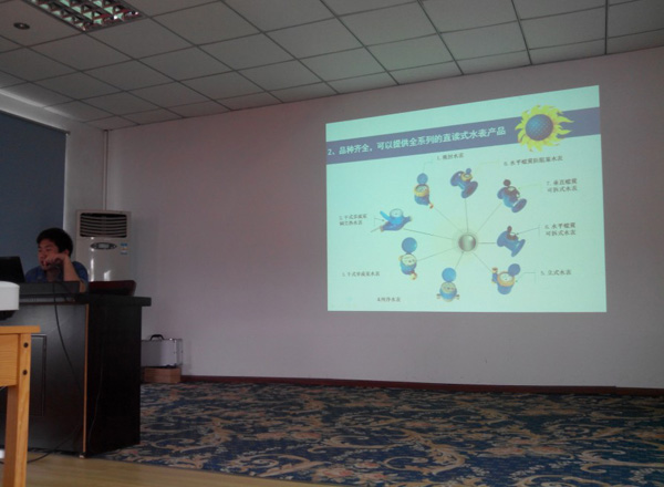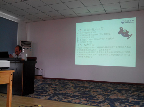 三川公司的桂經(jīng)理就普通型水表的種類(lèi)、運(yùn)行原理、安裝規(guī)范、注意事項(xiàng)、檢定知識(shí)和水表選型等方面向參訓(xùn)人員詳細(xì)進(jìn)行了講解。負(fù)責(zé)智能水表開(kāi)發(fā)研制的毛經(jīng)理又針對(duì)我公司暫未涉足的智能水表進(jìn)行了介紹。