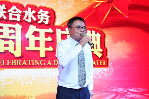 短片結(jié)束后,聯(lián)合水務集團創(chuàng)始人、董事長兼總裁俞偉景上臺致辭,他在致辭中回顧了公司起步時的艱辛:在北京的第一間辦公室從零開始,三位創(chuàng)始人一起為裝修辦公室自己動手刷墻;第一次在宿遷吃到全國最最正宗的“水煮魚”——白水煮魚;剛成立的宿遷公司僅有不超過七百萬的年收入,不得不絞盡腦汁節(jié)約成本......今昔對比,俞總動情地發(fā)出了“十年,整整一個時代,對于任何人都是一段相當長的光陰”的感慨,他說,“雖然十年中,我頭發(fā)白了不少,但感到高興的是,我們做的事情對社會是有貢獻的,我們在水務行業(yè)里面從無到有,從一個地方到多個城市,事業(yè)初具規(guī)模。我感恩,感謝所有人的支持和幫助,努力與付出,希望下一個十年更加燦爛,更加輝煌!”