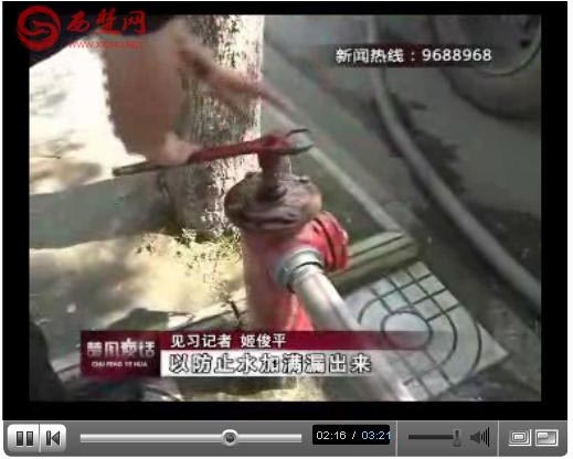 7月23日晚間,宿遷電視臺《楚風(fēng)夜話》欄目以“灑水除塵 我為城市降‘火’”為題,報道了環(huán)衛(wèi)部門每天給城區(qū)主干道灑水降溫的新聞。視頻中,我們通過鏡頭發(fā)現(xiàn)了以下三個問題。第一是水車未在黃色消防栓上取水(如圖),第二是水帶和栓體及車體間的連接處漏水嚴重,第三是駕駛員在水箱注滿并溢出后,才關(guān)閉消防栓,沒有通過車輛外置的水位示管來控制。