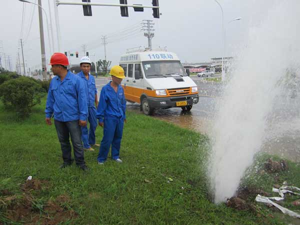 15時10分,第一輛工程車達到事故現(xiàn)場,管線組針對具體情況以縮小停水范圍為前提,拿出事先準備好的管網(wǎng)圖沿線查找并開關(guān)閘閥,同時及時告知客服部停水影響范圍,并對周邊工廠進行口頭通告和張貼停水通知。維修人員開始整理事故周邊現(xiàn)場。15時24分,工器具和材料送達現(xiàn)場,維修人員著手維修。
