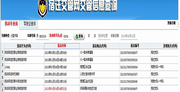 為了讓部門蘇N02316號皮卡車順利通過年審。8月30日,按人事行政部要求,稽查部通過宿遷市交管查詢系統(tǒng)對車輛有無違章行為進行了網(wǎng)上查詢。查詢結(jié)果顯示,從2012年11月至2013年7月間,共計有6起違章記錄。