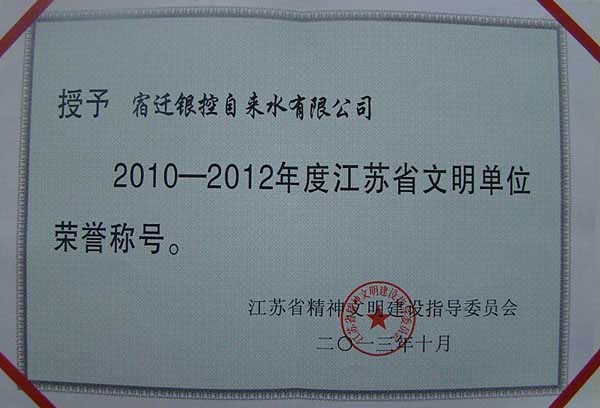 近日,宿遷銀控自來水有限公司被江蘇省精神文明建設(shè)指導(dǎo)委員會授予“2010-2012年江蘇省文明單位”的榮譽稱號,這是繼今年7月份被授予市級文明單位之后,宿遷銀控自來水有限公司在公司文明建設(shè)上的又一里程碑。