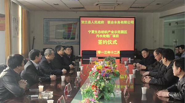 12月27上午,聯(lián)合水務(wù)有限公司與寧夏回族自治區(qū)賀蘭縣人民政府舉行了寧夏生態(tài)紡織示范園區(qū)污水處理項目的簽約儀式。集團董事長兼總裁俞偉景先生、副總裁陳樵先生、總裁助理兼業(yè)務(wù)發(fā)展部總經(jīng)理豐洪斌先生、投資經(jīng)理常猛先生等出席簽約儀式。儀式由園區(qū)管委會常務(wù)副主任梅振龍先生主持。賀蘭縣委常委紀委書記俞學(xué)華先生、縣委常委常務(wù)副縣長何建勃先生、縣委常委副縣長王旭、人大副主任郭占清先生、政協(xié)副主席董志敏先生等出席。