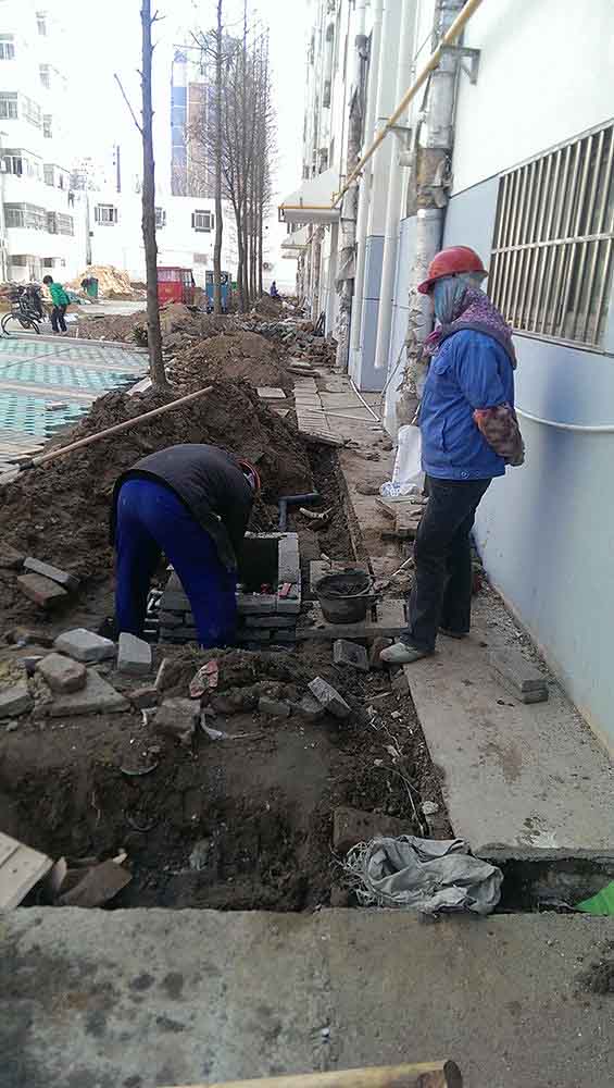 新園小區(qū)材料剛進(jìn)場(chǎng)時(shí),情況是:新的停車位基本成形,工人師傅正在貼道板磚;雨水井、弱電管線都已成形、入土。一眼望去,除了106棟,其他樓棟連下腳的地方都沒(méi)有,更別說(shuō)溝槽開挖。