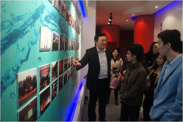 (圖4:劉總在水文化展示館向考察團(tuán)成員介紹宿遷公司的改制情況)