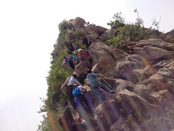登山過(guò)程中的困難確實(shí)比想象中多很多,第一就是險(xiǎn),都說(shuō)華山險(xiǎn),“自古華山一條路”,華山畢竟有路可走,但刀山?jīng)]有路,都是靠自己體能和意志攀爬出來(lái)的路。第二就是陡,六座相連山峰,每一段山石的坡度都在80度左右,艱難程度可想而知。第三是真正的“爬山”,由于山體的陡峭,部分人員已經(jīng)達(dá)到體能的極限,最后都是爬著登頂。經(jīng)過(guò)四個(gè)小時(shí)的煎熬,隊(duì)友的相互支持幫助,我們團(tuán)隊(duì)35名成員全部成功登山刀山之巔。