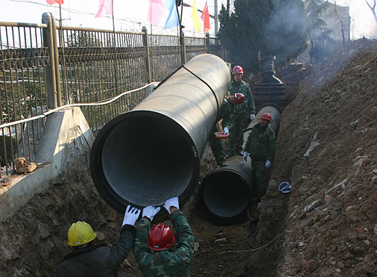 2006年12月,公司投入500萬元敷設(shè)DN800的原水管道,實(shí)現(xiàn)了原水雙路供應(yīng),進(jìn)一步加強(qiáng)了供水安全性。圖為DN800原水管道安裝現(xiàn)場。