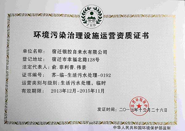 日,宿遷公司獲江蘇省環(huán)保廳發(fā)《環(huán)境污染治理設(shè)施運(yùn)營(yíng)資質(zhì)證書》
