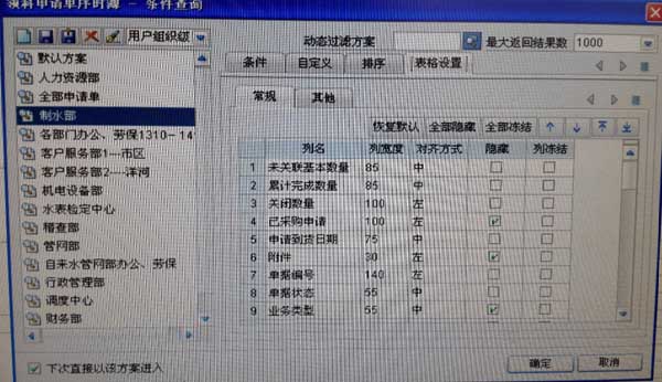 3、除了選擇相應(yīng)的查詢時間段外,更重要地是把你常用功能的表格給設(shè)置好。選取表格設(shè)置選項后,根據(jù)自己工作的實際需要把自己常用的功能選項按向上箭頭或向下箭頭調(diào)到合適位置并選好列寬,也可把用不到的項目直接隱藏,并點擊左上角的保存(不點擊僅當(dāng)次有效)