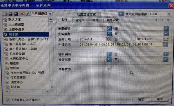 2、在常用功能中打開任一功能菜單,系統(tǒng)都是默認方案。這里我建議把默認方案給自定義為自己的個人方案,并在左下角的“下次直接以該方案進入”前方框內(nèi)打勾(下表是以制水部領(lǐng)料申請單為例),以便于下次打開直接登陸。